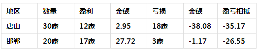 根据对唐山市2015年纳入统计的30家重点民营钢铁企业调研,盈利企业12家,共盈利2.95亿元;亏损企业18家,共亏损38.08亿元。盈亏相抵后,唐山市民营钢铁企业实际亏损35.13亿元。